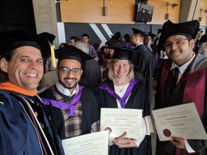 It was GREAT to see three HIT Lab NZ students at the UC commencement today! From right: Prof. Rob Lindeman, with Humayun Khan, Helen Figg, and Harish Mandalika. We wish you all the best in the future!